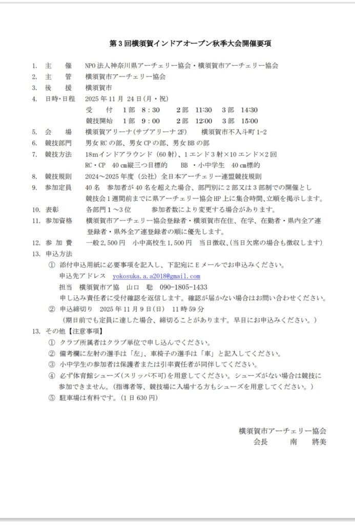 2025年11月24日(月祝)に第 3 回横須賀インドアオープン秋季大会を開催します。会場は横須賀サブアリーナです。